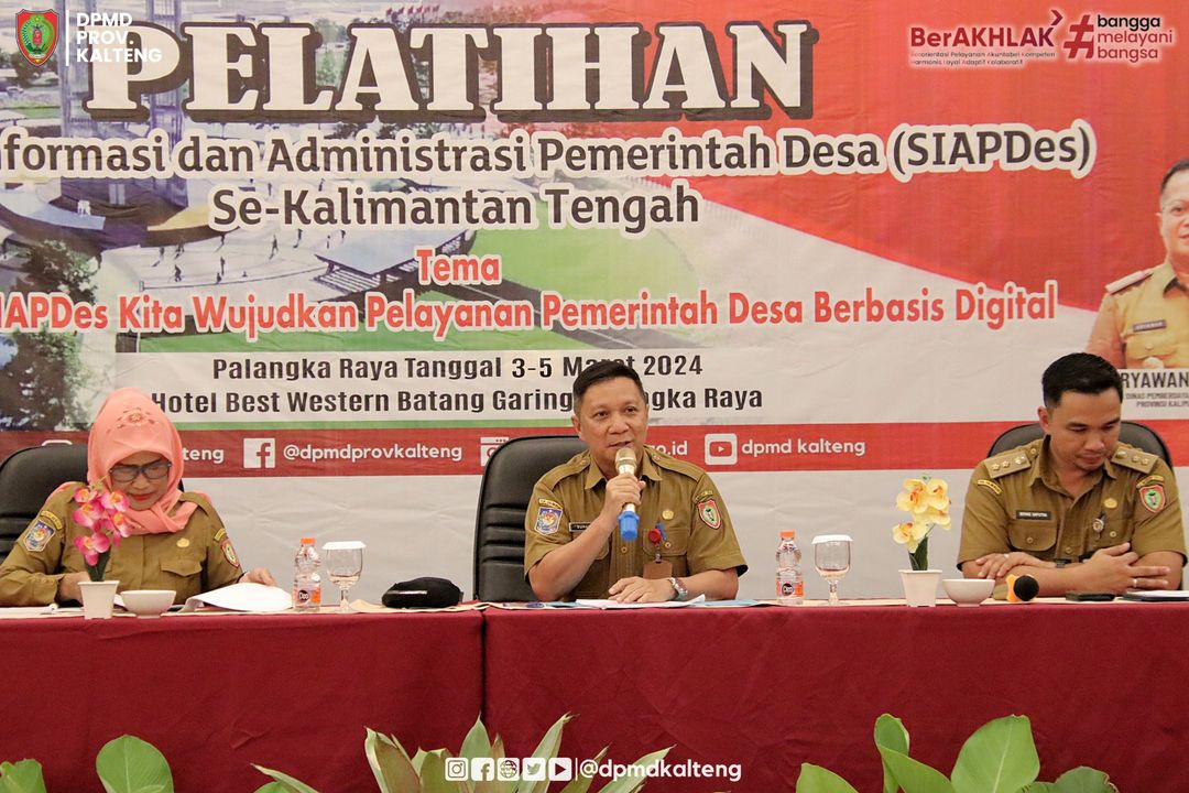 PMDKalteng – Palangka Raya – Kepala Dinas Pemberdayaan Masyarakat dan Desa (PMD) Provinsi Kalimantan Tengah, H. Aryawan melaksanakan kegiatan pelatihan Sistem Informasi dan Administrasi Pemerintah Desa (SIAPDes) Se-Kalimantan Tengah bertema Melalui SIAPDes Kita Wujudkan Pelayanan Pemerintah Desa Berbasis Digital, yang bertempat di Hotel Best Western Batang Garing Palangka Raya, Senin (4/3/2024).